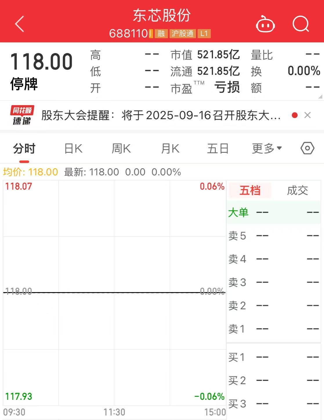 盘面上,截至停牌前,东芯股份股价报118元/股,总市值521.85亿元。