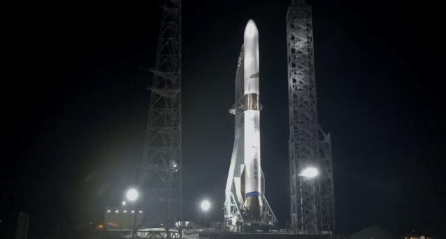 新格伦重型火箭在夜幕下竖起。图片来源:蓝色起源