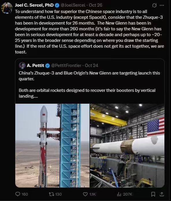 而美国航天专家乔尔 · 瑟塞尔博士则给出了更直白的数字对比:朱雀三号仅用了 26 个月发展到首飞节点,而蓝色起源的新格伦已经走了 260 个月,却依然在验证回收。一个零,一个数量级,构成了惊心动魄的对比。