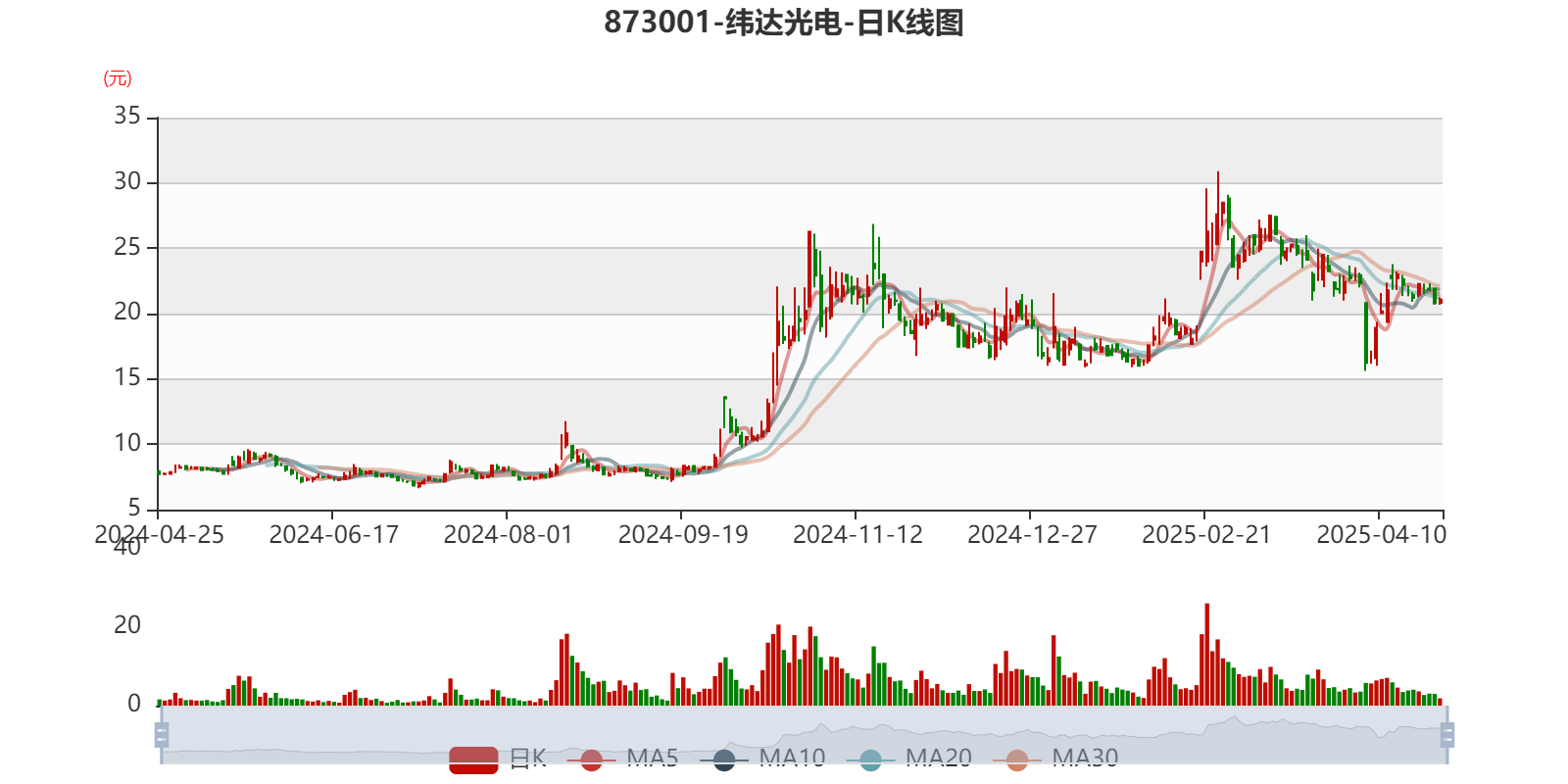 以4月25日收盘价计算,纬达光电目前市盈率(TTM)约为101.94倍,市净率(LF)约4.2倍,市销率(TTM)约15.25倍。