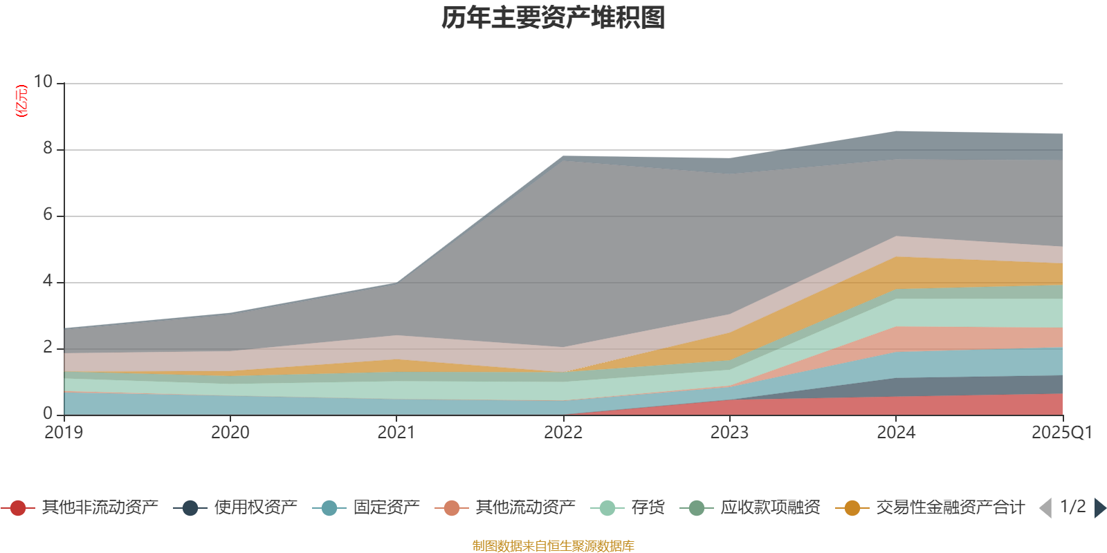 资产重大变化方面,截至2025年一季度末,公司交易性金融资产合计较上年末减少33.63%,占公司总资产比重下降3.79个百分点;货币资金较上年末增加12.64%,占公司总资产比重上升3.69个百分点;其他流动资产较上年末减少22.98%,占公司总资产比重下降2个百分点;应收款项融资较上年末增加44.28%,占公司总资产比重上升1.54个百分点。