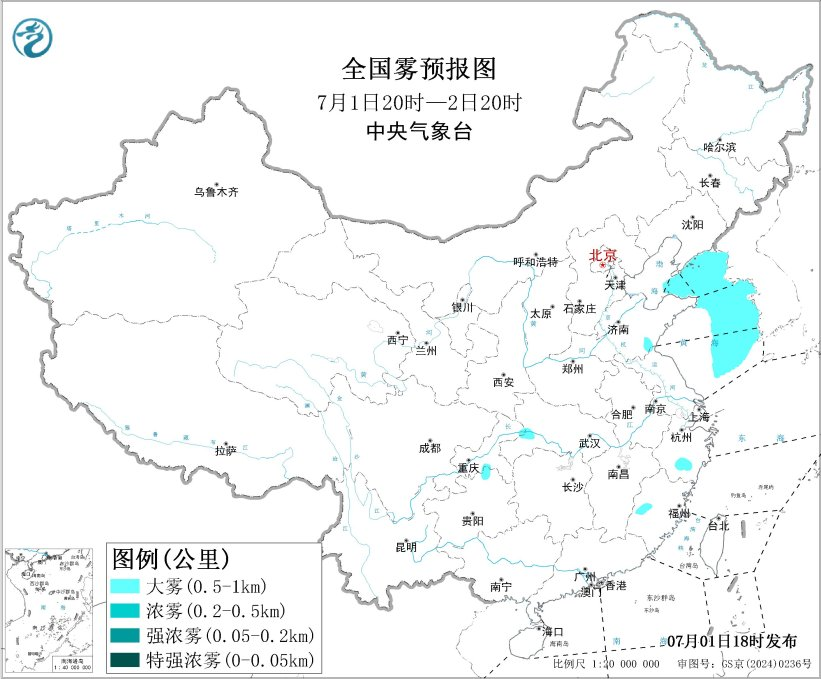 中央气象台7月1日18时发布大雾黄色预警: