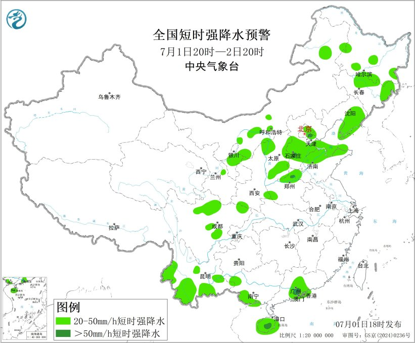 预计7月1日20时至2日20时,东北地区、黄淮北部等地的部分地区将有8级以上雷暴大风或冰雹天气,其中,黑龙江中西部等地的部分地区将有10级以上雷暴大风,最大风力可达11级以上,黑龙江中西部等地局地可能出现龙卷天气;东北地区、华北、黄淮北部、西南地区东部、华南南部等地的部分地区将有小时雨量大于20毫米的短时强降水天气,其中,河北中南部、北京东部、河南北部、广东中南部、海南岛中部等地的部分地区小时雨量大于50毫米,最大可达70毫米以上。