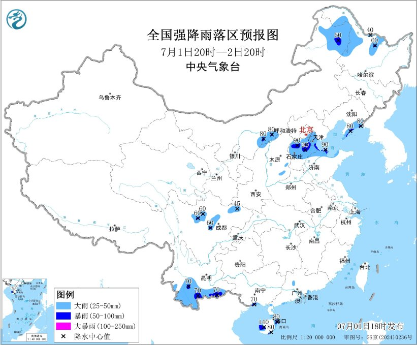 预计,7月1日20时至2日20时,内蒙古东北部和河套地区、黑龙江西北部、辽宁东南部、陕西北部、北京东部、河北中南部、天津、山东北部、川西高原北部、四川盆地西北部、云南南部、广西东南部沿海、广东南部沿海、海南岛西部和东部等地部分地区有大到暴雨,局地有大暴雨(100~140毫米)。上述部分地区伴有短时强降水(最大小时降雨量20~50毫米,局地可超过70毫米),局地有雷暴大风等强对流天气。
