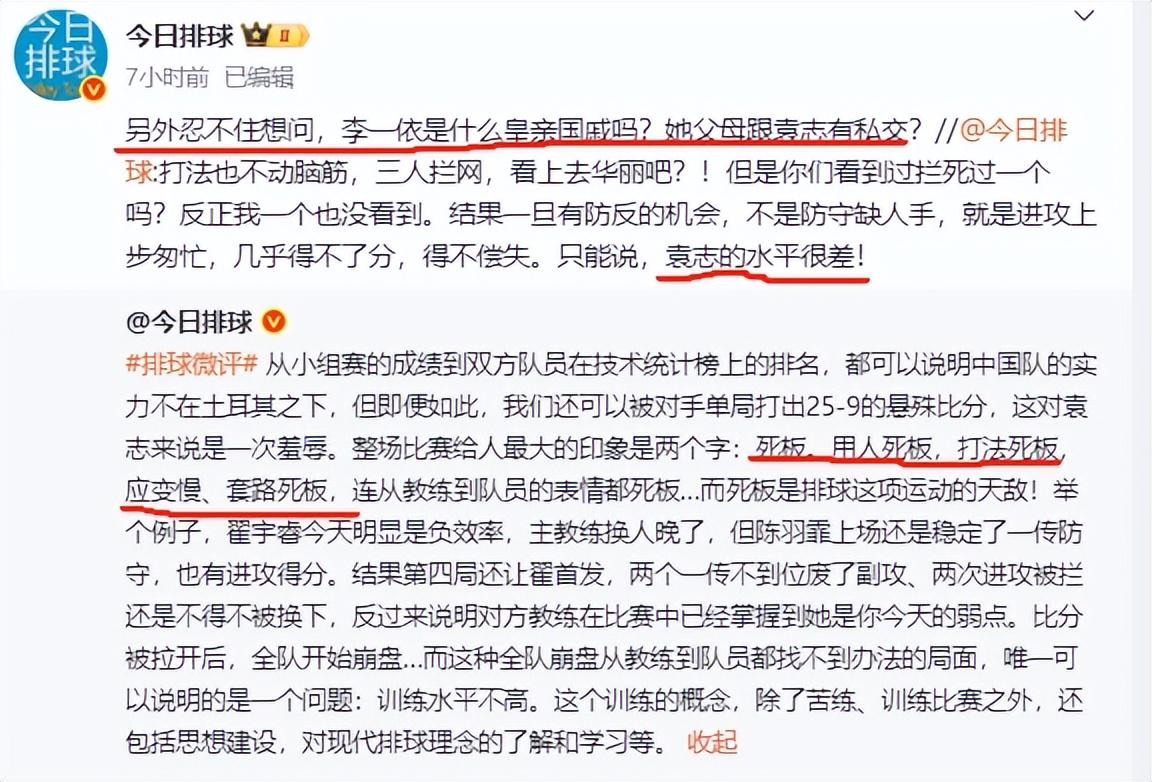 排球大V,有着240万粉丝的“今日排球”非常恼火,他忍不住怒问袁志:李一依是什么皇亲国戚吗?她父母跟袁志有私交?他直言袁志的水平很差!不是不可以输球,但这种明明有实力赢球,却因为自己的排兵布阵和临场调度输的球,让人觉得窝涩。