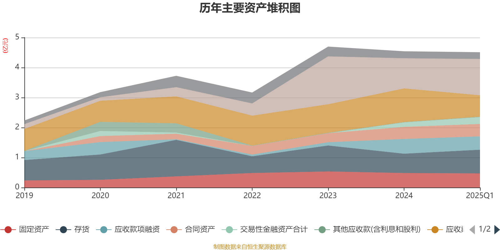 资产重大变化方面,截至2025年一季度末,公司应收票据及应收账款较上年末减少36.36%,占公司总资产比重下降8.87个百分点;货币资金较上年末增加20.29%,占公司总资产比重上升4.68个百分点;存货较上年末增加22.83%,占公司总资产比重上升3.36个百分点;交易性金融资产合计较上年末增加53.33%,占公司总资产比重上升1.8个百分点。