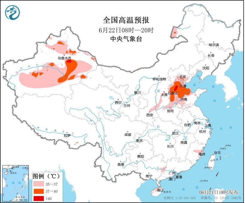 预计6月22日白天,北京大部、天津中西部、河北中南部、山东北部、河南北部以及新疆北部和南疆盆地等地有35~36℃高温天气,其中,河北中南部、山东北部、新疆南疆盆地东部等地部分地区最高气温37~39℃,局地可达40℃以上。